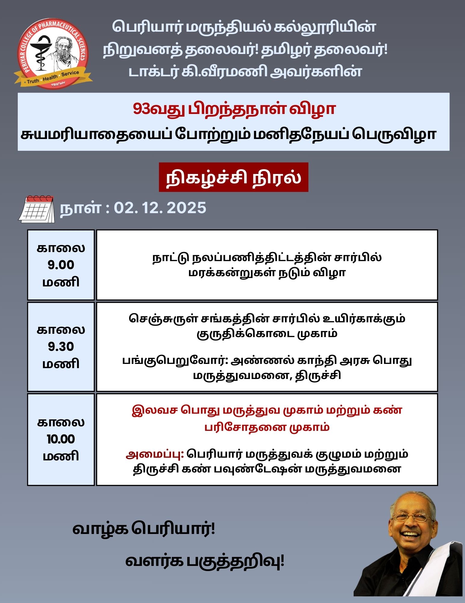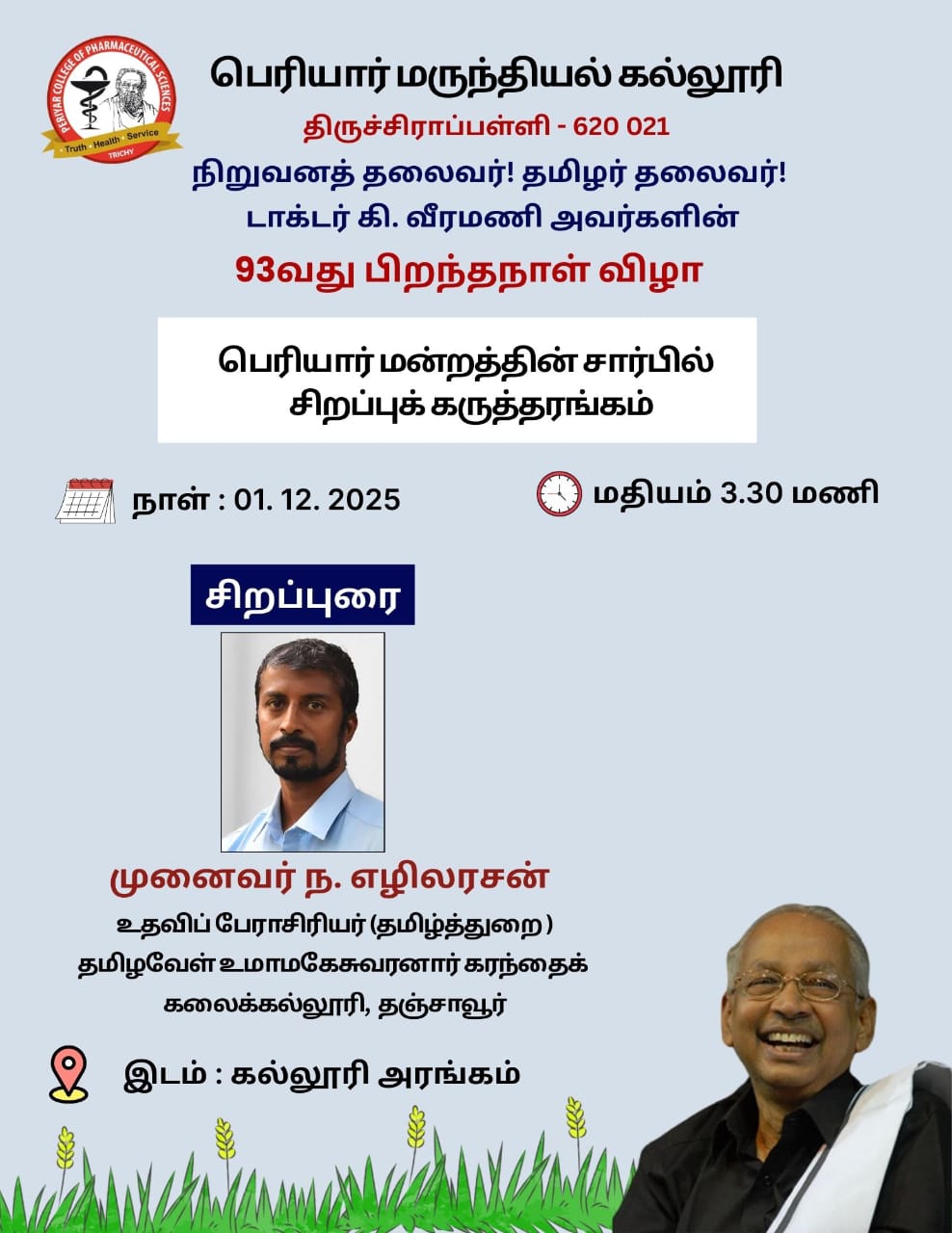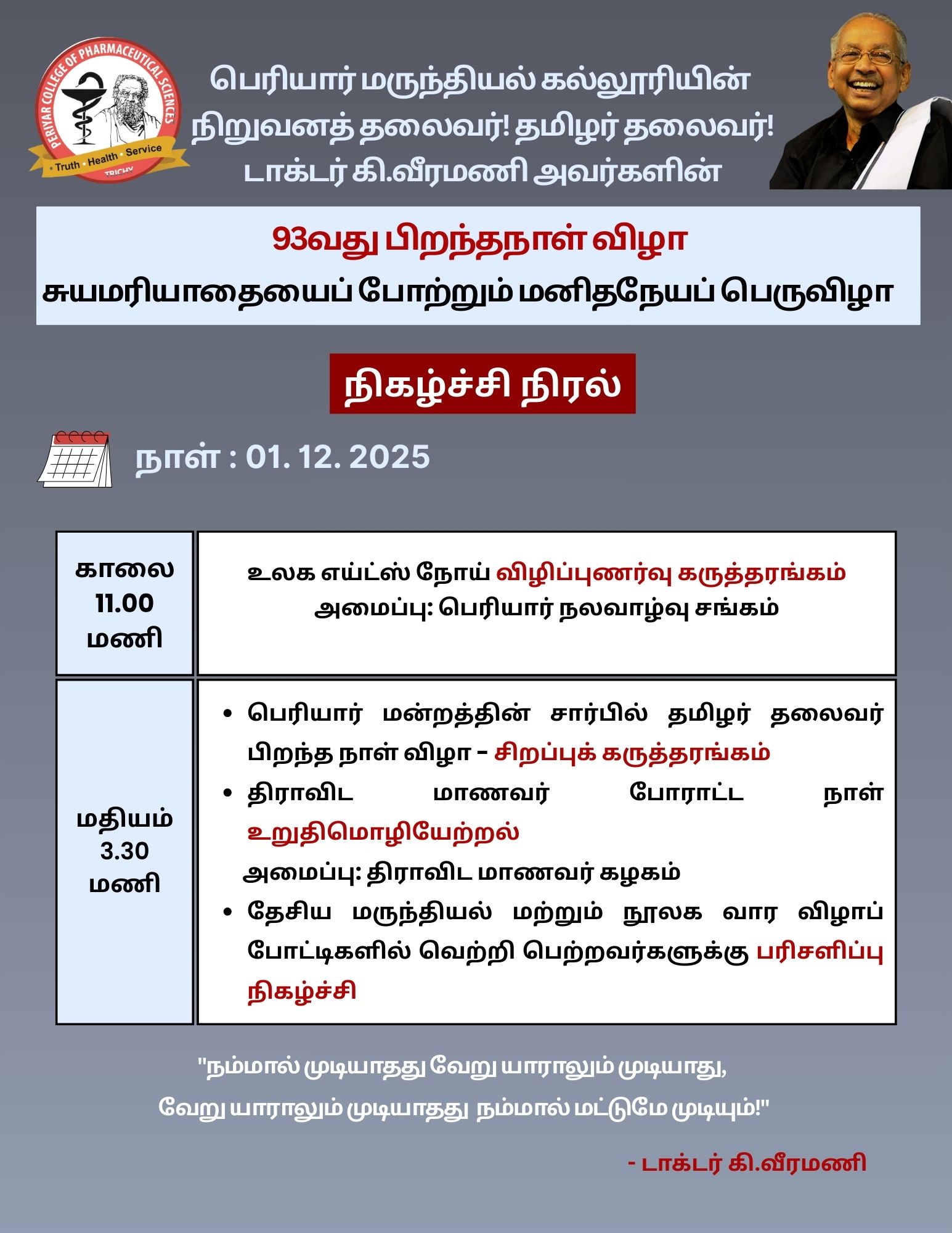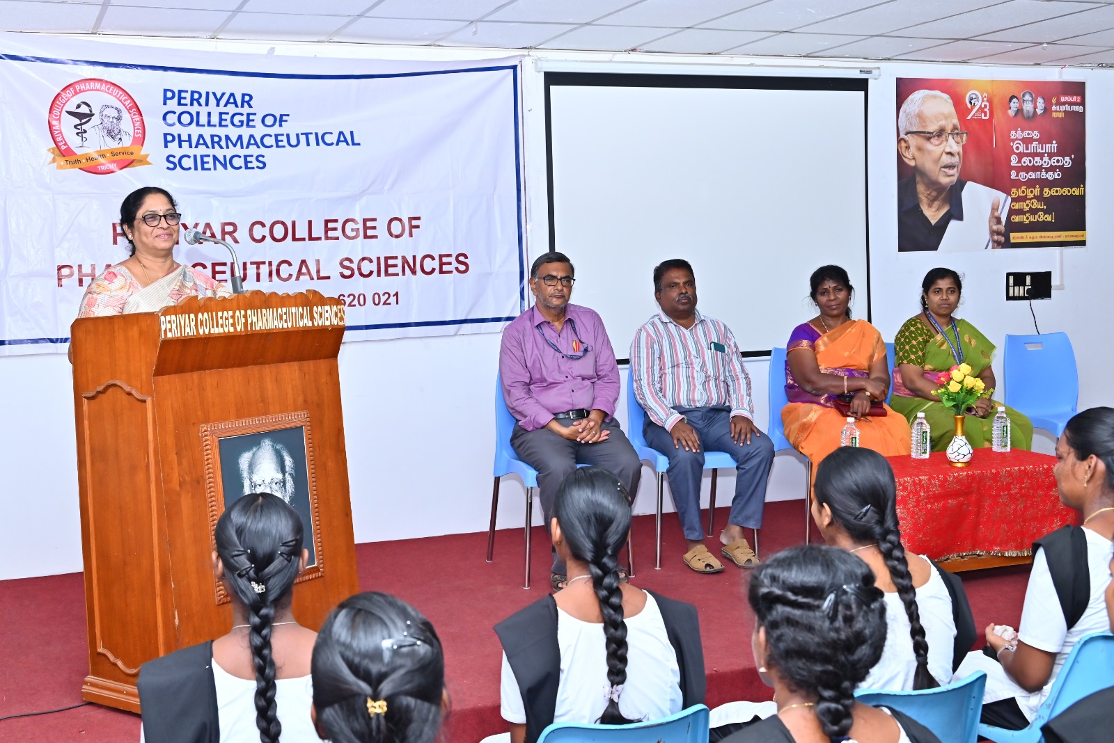 After THANTHAI PERIYAR and ANNAI MANIAMMAIYAR, their illustrious successor Thiru K.VEERAMANI M.A.,B.L., has taken up the Herculean task of ushering young women into Pharmacy education and to a new era of scientific temperament by leading this institution exclusively for women in the whole World.
